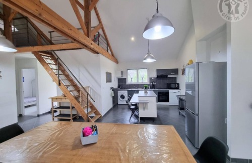 large living room with dining table for 10 people, cathedral living room Open and equipped kitchen with fridge-freezer, dishwasher, washing machine, Senseo pod coffee machine, electric oven, microwave, 4 induction hobs. Living room, 80cm TV.