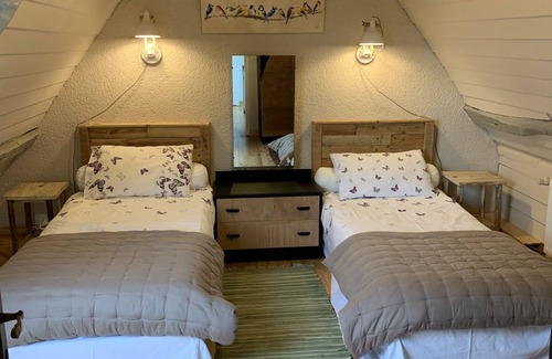 upstairs, an open tread staircase leads to two double bedrooms One bedroom has a king size bed and the other one has a couple of single beds. Duvets or covers are included.