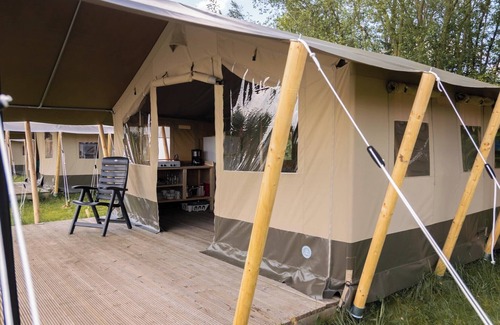 Experience the charm of glamping in the Dutch countryside with this fully furnished safari tent for 6 people, set on the scenic Natuurveld at De Betteld Zelhem. Located right by the water’s edge, the tent is surrounded by nature, grassy meadows, and a small beach—perfect for a peaceful retreat. Built on a wooden platform, it features two cozy sleeping cabins (with duvets and pillows included) and a spacious living area with a kitchenette, dining table, and chairs. Stylishly decorated with rustic wood furniture, the tent combines outdoor living with indoor comfort. A garden set on the terrace allows guests to relax and enjoy the tranquil views. De Betteld Zelhem sits in the heart of the Achterhoek, a region known for its rolling landscapes, forests, and charming towns. Nature lovers can explore the Veluwezoom National Park, while culture seekers might enjoy a day in Doesburg, a nearby historical town filled with unique shops, cafés, and galleries. Family-friendly outings include nearby adventure parks and nature reserves, while local farmers' markets and small museums offer a taste of the region's heritage and flavors. This safari tent is perfect for families, couples, or groups of friends who want to reconnect with nature without giving up the comfort of a fully equipped stay. With water, beach, and open green space right outside your door, it’s ideal for swimming, playing, and outdoor fun. At the same time, the peaceful surroundings make it a great escape for guests seeking quiet, rest, and a breath of fresh air.