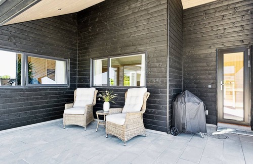 Single-family house, built in 2024. 200 m from the sea. Private: natural state property 1'618 m2, indoor pool (2 x 6 m, 1'6.2 m2, depth 140 - 140 cm). Outdoor shower, hot tub, barbecue, children's playground (swing). In the house: table football, trampoline, washing machine, tumble dryer. Parking at the house. E-charging station. Grocery 4 km. Golf course 8.8 km. The owner does not accept any youth groups.
