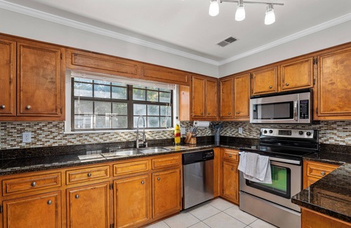 3 spacious bedrooms, each with private bath. Master bedroom on main level with 2 additional bedrooms upstairs. Granite countertops. Outdoor grill area. Two large decks for entertaining. Ample parking. Amazing proximity to Augusta National... you can walk! Also very convenient to Riverwatch Parkway, I-20 and Washington Rd. King bed in master bedroom(main level), queen bed in larger upstairs bedroom and double in third bedroom (upstairs). Please inquire if you have special requests or questions!.