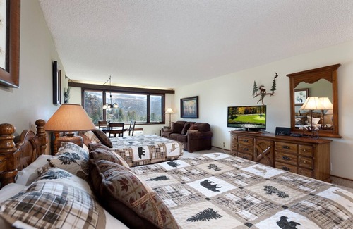 enjoy the resort’s premier amenities at the south end of the lodge, including a heated pool, relaxing hot tub, and a fully equipped fitness center The studio offers sweeping mountain or forest views—a peaceful backdrop for morning coffee or quiet evenings.