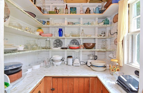 the main level includes the living room which opens to the verandah and deck, dining room, kitchen, study and half bath The comfortable eat-in kitchen with walk-in pantry is well stocked with everything necessary to prepare meals for 12 people including a dishwasher, 5 burner gas stove, plenty of dishware, and a large capacity washer and dryer.