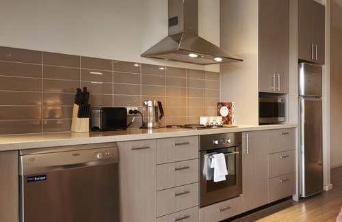 the kitchen boast stainless steel appliances, a convection cook top, oven, dishwasher, plenty of storage and a generous bench space, allowing you to entice your inner chef All dinnerware, glassware and cutlery can be found in the kitchen cupboards for those wanting to cook, wine and dine in as well as complimentary tea, coffee, water and snacks for you to enjoy. For the travelling professional, next to the dining table is a small work space available for your use.
