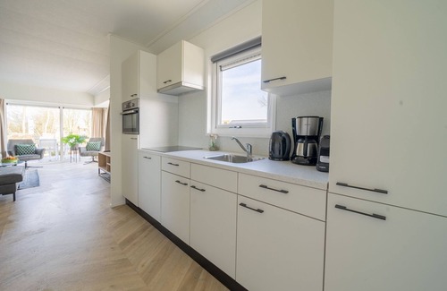 This modern, detached, single-storey chalet is located in brand-new (2021) Resort on the Maas, on a side branch of the river with the same name, near Kerkdriel. The chalet is furnished in a comfortable and pleasant way. There is a living room with TV and an open plan kitchen with, among other things, a dishwasher and a microwave. There are three bedrooms, of which two with two 1-pers. box spring beds, whether or not in a 2-pers. setup and one with a bunk bed. The bathroom has a shower and a toilet. Outside you have a garden with a terrace and garden furniture. There is parking for one car at the chalet. Several cars can be parked in the central car park. Please note that due to the layout it is not possible to place a cot in the bedroom. Resort aan de Maas is a resort under development. So it's possible that it is undergoing construction during your visit. We do our utmost to restrict possible inconvenience as much as possible. At Resort aan de Maas, you can book various types of holiday accommodations for four to ten people.