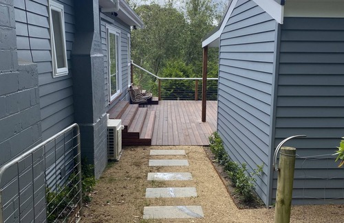 we have recently added a detached studio area with foldout queen bed (very comfortable) and additional toilet and kitchenette, which is made available for bookings of 4 or more guests there is a glorious outdoor shower beside the main deck.