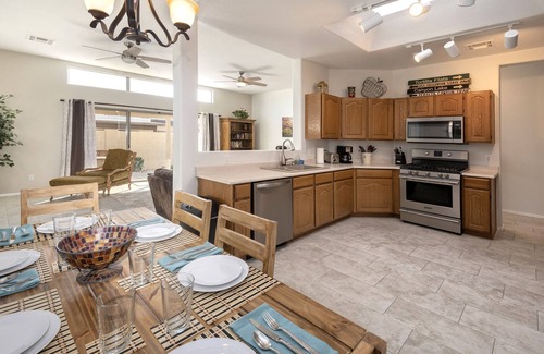 the home has everything you need - just show up with your suitcase of personal items The kitchen is heavily stocked with plenty of dishes, silverware, and cookware. Don't be afraid to stay in and cook a night at home. There is also a full size grill on the patio along with 2 tables that seat a total of 8, if you are looking to enjoy the beautiful Arizona warm weather.
