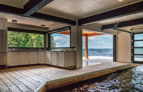 the impressive, exceptionally built 2-slip boathouse with an additional jet ski slip (only 1 slip available for renters) features a spacious lower level with sleek glass doors, a large double-door refrigerator w/ freezer, a sink, a bar area, a 2-pc bathroom, and a lower level sundeck with muskoka chairs With enough seating area for 8 people, the extensive upper deck is the perfect place to catch some rays or cool off with a cocktail. the boathouse will be the perfect place to spend your summer days, and constant music playing through the sonos system outside is the cherry on top!