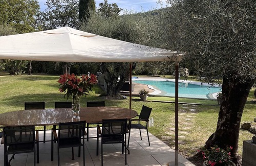 Villa Les Lucioles is the perfect property for a large family or group of friends. It enjoys a large, flat, & completely enclosed garden with lovely views of the surrounding mountains. The large pool has a great shallow pool area, perfect for children to play in. Around the pool patio are many sun lounger’s for those wishing to relax & soak up the sun & a shaded outside lounge area. Inside the villa, most of the living space is on one level. The kitchen & dining room open directly onto the garden/pool area. There is shaded eating area right outside the kitchen which overlooks the pool. The living room is spacious & bright. It opens onto the smaller garden which has a nice quiet courtyard. There are 4 bedrooms on the main level, one bedroom in the character tower room & the sixth bedroom on the ground floor. All bedrooms have air conditioning. Pool heating is possible, please ask for price. Villa Les Lucioles is walking distance into the village of Bar sur Loup (approx. 20 mins.) where there are several restaurants, shops, & outdoor markets..