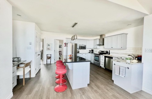 the open-plan living area blends the living room, dining space, and kitchen with grey cabinetry, white walls, and vibrant red accents The kitchen is fully equipped for all your meal needs, with a modern wooden dining table and a peninsula with stools for casual dining or planning your day. You can also cook outdoors on the gas grill while enjoying ocean views. Appliances include stove, dishwasher, microwave, fridge, washer/dryer, and the outdoor BBQ. The living room has a sofa bed for two guests, a Roku TV, high-speed WiFi, propane fireplace, and breathtaking views across the water to Cavendish.