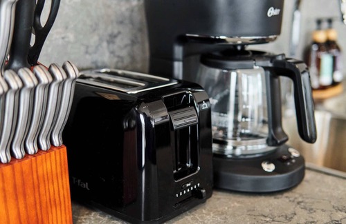 on the first level, you’ll find an open-concept living and dining area perfect for socializing or relaxing The chef’s kitchen is fully equipped with stainless steel appliances, including a double-door refrigerator, full-size oven, 4-burner ceramic stovetop, coffee maker, toaster, microwave, and chef’s knives. The breakfast bar seats 4, while the elegant dining table accommodates 6. Sunlight floods the space through expansive sliding glass doors, offering a seamless connection to the outdoors.
