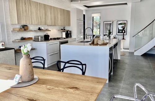 as you walk in, the open plan kitchen and living room space open up through wall to wall sliding glass doors to a fenced backyard featuring lounge areas, a fire pit, umbrellas and chaises lounge, grass tiles and beautifully landscaped tropical gardens
