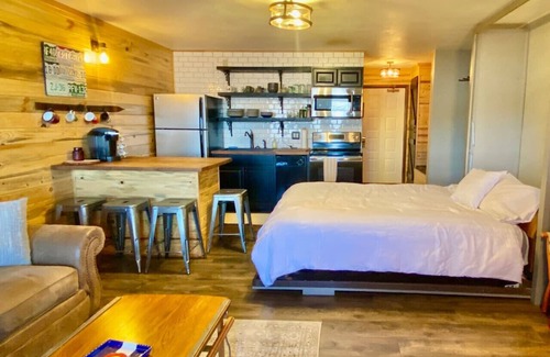 this renovated and fully equipped condo includes all the comforts of home with a fully stocked kitchen, wood-burning fireplace (composite logs only), private patio, a full bathroom with tub/shower and double sinks, a queen-size murphy bed, and a queen-size sleeper sofa