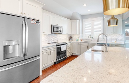 as you reach the top level of this incredible home, you'll pass a half bathroom off the stairway Movie nights and quality time can be enjoyed in the spacious living room with modern fans, stylish decor, and luxury blinds. Moonshine's exquisite kitchen holds stainless steel appliances, gorgeous countertops, a backsplash, and bar seating. Off the kitchen is the dining area with seating for everyone - perfect for group meals and games! There is also another main bedroom with a king bed on this level. Experience incredible ocean-side views on the covered deck with comfortable seating for all and a table for dining.