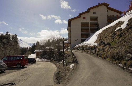 Residence "Grand Vue". In a quiet position, directly by the skiing area. In the house: storage room for skis, washing machine (extra), tumble dryer (for shared use, extra). Communal covered parking. Grocery 60 m, restaurant 100 m, bus stop "Les Thermes" 350 m. Please note: In case of good snow conditions, the house is accessible on skis.