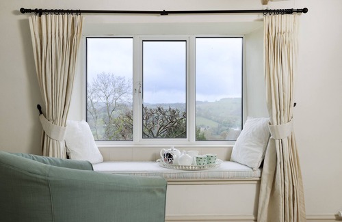 upstairs on the first floor you will find bedroom one, with lofty high ceilings and oak beams, a king-size bed and lovely woodland views The family bathroom; bedroom two with a small double (4ft) bed suitable for one guest; and the day room with a 2'6 single day bed (suitable for a child) are also located on the first floor, both these bedrooms feature charming window seats for enjoying the views. Bedroom three is located on the second floor and accessed via steep spiral stairs. This room enjoys more lofty high ceilings, exposed beams, a double bed, and a television. The views from up here are splendid! The property has four bedrooms when the day room is being used as a bedroom, however can only accommodate a maximum of four guests plus an infant.