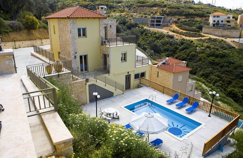 The Great Escape Villas are 3 comfortable, cozy, and very well equipped holiday homes on a slope nearby Maroulas above the bay of Rethymnon on the island of Crete. Each of the houses includes two completely equipped apartments.To each villa belongs a private sun terrace with a 23 square meters swimming pool, and a barbecue facility.There are sunbeds and umbrellas on all terraces.The nearest sandy beach is 2 km away..