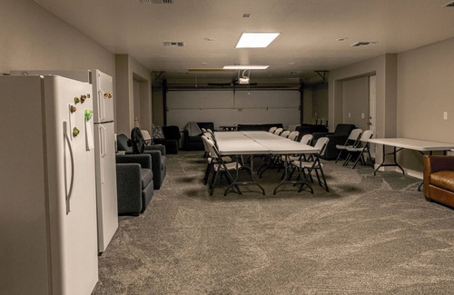 This is an incredibly spacious 5300 sq. foot home that Sleeps 25 within 5 bedrooms and has 3 bathrooms. Two of the bathrooms have walk in showers and one has a tub/shower combo. In the Master Bathroom there is also a large garden tub. You will love the Large Kitchen with double ovens, two sinks, two dishwashers, and 3 refrigerators/freezers. It is stocked with dishes, cookware, glassware, silverware, and spices. In addition, the two main living areas are set up with a total of 27- 6 ft. tables. Each table has a light and chair plus electrical access. It is a great set up for crafting or meetings. There are areas with couches and a bar area for lounging. There is also seating under the outside shaded patio or by the large outdoor pool. There are two tv's and lot's of Free WIFI.