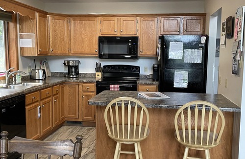 our open-concept great room awaits your arrival Enjoy your mornings with a fresh cup of coffee listening to the birds on the huge wrap-around deck overlooking the water. Enjoy cocktails on the deck with a beautiful sunset view. You may even catch a glimpse of the Northern Lights from the deck. In cooler weather, cozy up by the fireplace in the great room overlooking the lake with pine cathedral ceiling. Huron Lodge is complete with a great room, dining area, an updated full kitchen, enclosed 3-season sunroom, full bath, and 2 bedrooms on the main level. The lower level includes large finished, family room, bedroom and another full bath. A walk-out deck off the lower level gives quick access to the lake. Comfortably sleeps 14 in a variety of configurations including 5 queen beds, a queen futon and two twin beds. Loft bedroom upstairs from main level. All bedding, sheets, towels and beach towels provided. 50" Smart TV with YouTube TV on the main level, 40" Roku TV with YouTube TV and Xbox 360 gaming system in the lower level family room along with a foosball table. Also available for you are a selection of 'old school' games - decks of cards, poker chips, and board games.