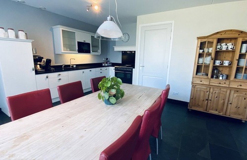 In 's-Heer Abtskerke, near Goes, Zuid-Beveland, you can rent this beautiful group accommodation for 14-16 people. The holiday home is furnished in a country style and is fully equipped, including a sauna and whirlpool, and is suitable for people with disabilities due to the bedroom and the adapted bathroom on the first floor. It is very spacious so you can dine together with 16 people and the location offers you optimal privacy. This fantastic holiday home is located in a small and friendly village in the outlying area south of Goes. It can be found on the edge of the village and is surrounded by meadows. There are many cycling routes on the island which lead you through the so-called hedge area with its meadows and the flower dykes. It is a beautiful environment for going on beautiful bike rides and wonderful hikes. In the spring, the fruit trees are blooming with lots of flowers, and in the fall, the trees turn into the yellow and red shades of the fruit. it is amazing to see!
