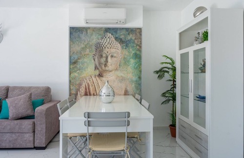 bright and airy, the apartment is designed with floor-to-ceiling windows andan open floor plan The living room features one comfy sofa bed, a flat-screen TV, and a dining table for four.