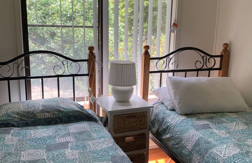 bedroom 1: 2 single beds (hanging rack for clothes storage) bedroom 2: double bed with wardrobe 3: 2 single beds with wardrobe