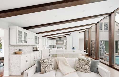 step in to the luxurious master bedroom and junior master bedrooms both located on the first floor, custom walk-in closets, with bathrooms that are the epitome of understated elegance and spa like accents An abundance of natural light accentuates the separate studio apartment with its own entrance located on the north wing of the property. Perfect for guests requesting extra privacy, this studio features full bath and kitchenette complete with high-end finishes.