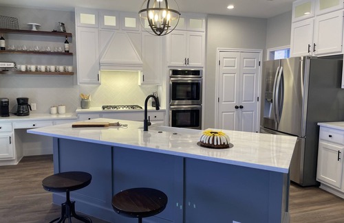 the easy flowing floor plan makes this house ideal for gathering large groups together The plush and comfortable living room with high vaulted ceilings allows for natural light to come in a bank of windows. There is plenty of room to gather around the large screen TV to watch a game or movie on the DVD player. The kitchen is completely open with bar seating and breakfast nook. The custom built island adds extra prep and serving space with easy access to the 5-burner gas range and double oven. The kitchen also includes a microwave, crockpot, toaster, blender, drip coffeemaker and Kuerig.