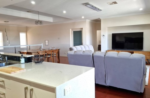 property details: 5 bedrooms - king, queen [upstairs]; queen with single & trundle, queen & toddler bed; queen & toddler bed [downstairs] Sleeps 14 (maximum 10 adults, single and toddler beds only suitable for children); Quilts, blankets and pillows provided – BYO sheets, pillowcases, towels, bathmats & tea-towels OR optional linen hire $170 available through Country Getaways office; optional linen service fee $80 for beds to be made up. Portacot (guests need to bring all bedding to use); Guests need to provide linen for toddler beds. Ensuite bathroom adjoining upstairs master bedroom with walk-in shower, vanity and toilet; Separate toilet; Main 3-way bathroom downstairs with vanity, bath and walk-in shower; Separate toilet. Ducted air-conditioning throughout; Ceiling fans in all bedrooms. Wall-mounted televisions (with USB & HDMI ports) in all bedrooms. Lift access to both floors. Fully equipped upstairs kitchen with gas stove and oven, microwave, dishwasher, filtered water and large side-by-side fridge/freezer; Coffee machine (guest need to bring beans to use or purchase locally); Small kitchen appliances including kettle, toaster, electric hand beater, sandwich press, and airfryer. Large extendable dining table; High chair; Booster seat; Baby rocker. Upstairs lounge room has spacious sofa seating with electric recliners; Large television (with USB & HDMI port); Board games; Jigsaws. Spacious balcony adjoining upstairs living area with outdoor dining, ceiling fan and canal views; Hooded gas barbecue on balcony; Pizza oven. Stairgate. Kitchenette located downstairs with bar fridge, microwave, sink, kettle and toaster; Downstairs family room has large television (with USB & HDMI port); Large corner lounge seating with chaise; Toys. Front load washing machine; Clothes dryer; Ironing board; Iron; Pull-up clothesline; Clothes airer. Ice machine located in laundry. Undercover entertaining area on ground level overlooking pontoon; Outdoor seating and dining. Fish cleaning sink. Access to pontoon & marina frontage; Lights, water & power are available on the marina pontoon; There are swimming steps off the pontoon; Marina pontoon is available for tethering of boats; Guests do not have access to the boat lifter. Off-street driveway parking for up to 3 cars; Room for a boat to be parked in the driveway; No garage access for guests. 5 minutes’ drive or 30-minute walk to North Beach. Sorry, pets not permitted.