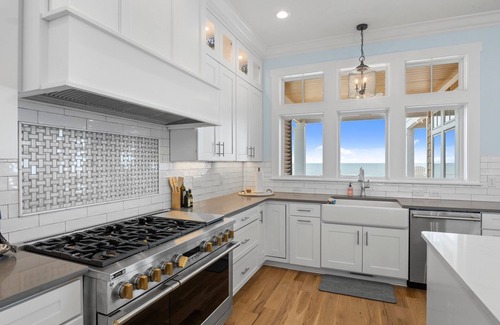 the second level is the main floor of the house, where you will gather with guests to relax, enjoy meals together or plan parties, big or small This house is the perfect place to celebrate any occasion, and the backdrop of rolling waves and sunshine will enhance any event! The main living area is all windows and light with an incredible amount of space that make mingling and spreading good cheer effortless. This floor includes a gourmet kitchen, dining and living areas a flat-screen TV over the mantel, and additional cozy seating that faces the sea- the perfect place to have your coffee in the morning. This level is also where you will find one of the primary bedrooms with a full master bath and walk-in tile shower. there is a powder room with a half bath in the foyer, too!
