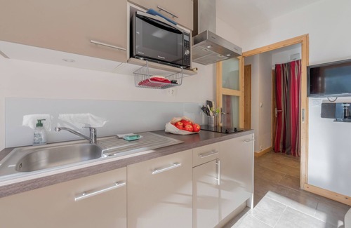 the studio is full of light thanks to large glass doors which lead out onto a private balcony Here guests will find a café-style table and chairs where they can enjoy a glass of wine or cup of coffee with stunning mountain views. Inside, the living area has a sofa and a flat-screen TV. The dining table for 4 people is opposite the open-plan kitchen. The kitchen is equipped with a cooker hob, oven, microwave, fridge, dishwasher, a Nespresso coffee machine and fridge.