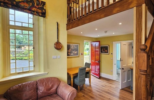 entry is into a tastefully furnished kitchen and dining area To the left is a large ground floor bathroom. To the right there is a living area with a leather Sofa and Smart TV. a staircase from the living area leads to the bedroom mezzanine level
