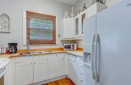 the home's kitchen is a cheerful and welcoming space It features an oversized peninsula with beautiful wood countertops. Offering a full roster of full-sized appliances, this kitchen comes stocked with a refrigerator, oven, dishwasher, cooktop, microwave and coffee maker. A lovely "breakfast nook" table is tucked under the large window in the kitchen. The large glass sliding doors in the kitchen lead to the home's private deck where you can dine in the shade of an umbrella while soaking in fresh air. A slice of heaven in the city, this deck features a lovely patio table that is made for morning coffee just after sunrise. yes, this is one of the vacation rentals savannah ga guests looking for a connection to nature must consider!
