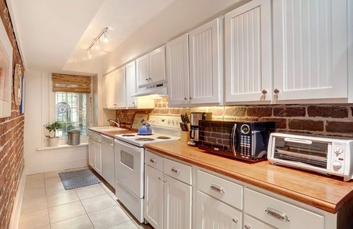 jones street retreat is a vacation rental savannah visitors will be happy to find This one bedroom/one bathroom apartment reflects the spirit of the era with exposed brick walls in the interiors set off by wood flooring and antique décor. This elegantly decorated historic Savannah rental comes with a modern kitchen equipped with the supplies and equipment needed to whip up gourmet meals for yourself and your guests. It has a full-size oven and dishwasher, giving guests a sense of being in their own homes.