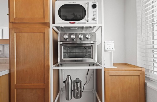 the kitchen is stocked with everything you need to cook like a pro, from cookware and bakeware to stylish dishware Start your mornings with the kuerig coffee maker, complete with a generous supply of complimentary coffee. Please note that we do not have a traditional oven, but we do have a cooktop, a microwave, and a 7-in-1 convection toaster oven that can air fry, bake, toast, broil, dehydrate, and warm.