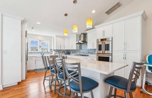 top level: this astounding home is going to stand out from others! beginning with the massive gourmet chef's kitchen (3 x the size of other houses this size!), appointed with everything you can imagine! all ge monogram commercial appliances include full-size double ovens, a french door top oven, a beautiful oversized island with bar stools, a microwave, and a prep sink equipped with every kitchen utensil, gadget, cooking, baking, eating, drinking, entertaining item you can think of, even a coffee bar station! the large dining table will host many family meals or be the perfect setting for evening games! enjoy ocean views from the posh living room featuring a large screen, a frametv so guests can view their pictures at the end of each day, a gas fireplace, and interior design like you've never seen! the top-level king master suite will be the perfect getaway offering a soaking tub, a beautiful tile shower, double vanity, closets with a sitting bench, and the ideal spot for morning coffee!