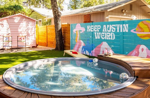 Centrally located unique stay! Resort backyard with Heated 8 Ft Cowboy Pool, Ping Pong, and fire pit. Minutes from: Downtown (8), Rainey St (7), UT Austin (6), The Domain (12), East Austin (9), Zilker (12). Nestled in historic Hyde Park, easy access to H-E-B, Total Wine, Bakeries, coffee shops, and restaurants. Sleeps 10 comfortably with 7 beds. ask about renting the detached back studio for a 14-person retreat!