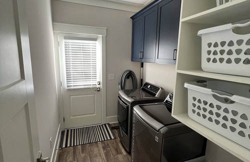 lower walk out basement is the ultimate hangout area with comfy sectional couch to watch the big game or movie on the 80" tv screen Kitchenette area with bar stools and mini fridge to serve up a few snacks. 6 person game table to play cards, board games or do a family puzzle. Full bath and bedroom with (1 queen, 1 bunk bed with single over double bed) Large lake prep-room leads to the outdoor shower and backyard with fire pit overlooking the lake! Enjoy the view of the lake while you cook on the propane Grill right off the back porch.