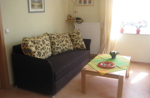 On 48m² this apartment has everything you need to spend a relaxing holiday with up to five people. The bright and cheerful bathroom has modern furnishings and is adjacent to the bedroom. The bedroom is furnished with a double bed and another sofa bed. The open living / dining area invites you to linger. The kitchen is modern and fully equipped. The house also has a terrace, which is connected to the living area. To terrace includes a seating area and a beach chair. An additional cot can be provided on request.