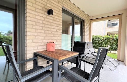 you enter the heart of the apartment via the entrance area: the open living-dining area Here you will find a fully equipped, glossy red kitchen, the dining area and the living room. Red accents run through the living area and were skilfully staged by the owners. A large flat screen TV provides the best entertainment. From the living room you can access the large, roofed east terrace with modern garden furniture including loungers.