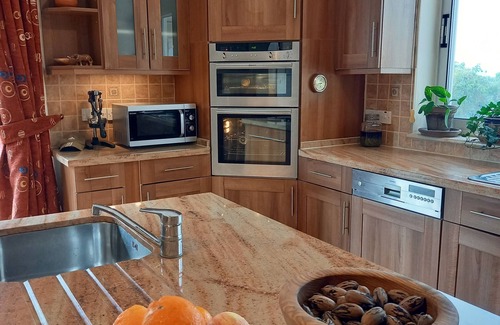 the kitchen is huge and well-equipped, with a breakfast bar, eye-level double-oven, fabulous slate extractor hood, and beautiful granite worktops There is a dishwasher, large American-style fridge-freezer, washing machine, microwave, kettle, toaster, coffee machine and all the pots, pans, tools and crockery you can think of.