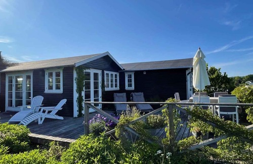 This holiday home shines with light and has just been renovated with a breathtaking view, where large door and window sections open up to nature and the sea. An atmosphere of coziness and modern Scandinavian style characterizes the interior, where calm colors and natural materials create a pleasant atmosphere. Located in a peaceful summer cottage area, the house rests on a large, elevated natural plot, surrounded by a lush and unassuming garden. Here you can experience the beauty of the dune roses, light a bonfire and pick fruit from the trees.