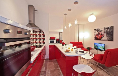 you will be charmed by the resolutely contemporary style of a fully equipped kitchen, designed and designed in italy, combining the charm of raspberry colors and the modernity of the equipment