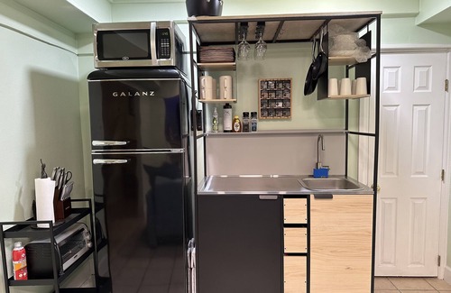 relax in the open-concept living area with cozy seating, record player, guitar, and a smart tv - all willie nelson themed The well-equipped kitchenette includes a fridge, induction hot plate, microwave, toaster ver, air-fryer, pots and pans, and coffee setup — perfect for home-style meals. Eat indoors or out on the spacious deck surrounded by nature.