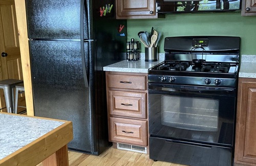 the cabin was built in 2017 and has modern amenities, yet still has the cozy feeling of an authentic adirondack log cabin The large deck on the main level looks out over Schroon Lake and the view is amazing! There is a table and chairs with an umbrella and a propane grill. The living area on the first floor boasts a vaulted ceiling with tons of natural light from the many windows. The living area opens up to the kitchen and dining area so everyone can stay connected and enjoy their time together. The lake views from this area are so beautiful! The first floor has two bedrooms - one with two twin beds and the other with one queen bed.