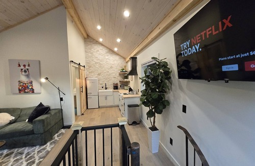 enter at the upper level where the blended living room & kitchen is a perfect example of how a well-designed space can maximize functionality without sacrificing comfort or style The 14-foot vaulted wood ceiling gives the space an open and airy feeling while the natural light pours in through the multiple extra-large windows. The Living Room couch has two movable ottomans for your comfort as you enjoy your favorite show or movie on the 55-inch Smart TV. The fully stocked kitchen is easy to navigate perfectly balancing form and function while also inspiring creativity and joy.