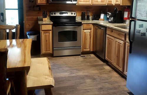 the cozy interior is ideal for a couple's romantic getaway or a young family's annual vacation Enjoy the warmth and glow of the wood burning fireplace while you recline on the sofa in front of the large screen TV, or challenge your companions to play some of the 412 games on the in-house Arcade Machine. Watch your favorite Cable TV programs, surf the internet and connect with the outside world via free WiFi - if you want to. Prepare hot meals in the fully equipped, all stainless kitchen. All you need add is groceries. Whether couple or family, you'll appreciate the two large bathrooms complete with linens for your stay. A king size bed in the master suite, another full size in the second bedroom and a large sleeper sofa with gel mattress means there's room to sleep as many as six. You'll even find a washer and dryer, ironing board and iron for your convenience.