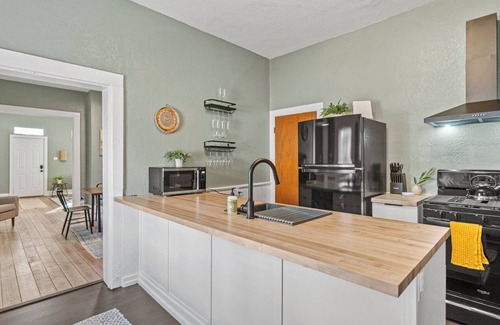 upstairs are 3 spacious bedrooms and one full bath The bedrooms feature one King and two Queen sized beds. Our guests love that this historic home still has all of the modern touches you come to expect, plus all of the amenities of a hotel. Fast wifi and location close to downtown! Both free street parking as well as a private, new parking pad in back. New concrete patio with grill.