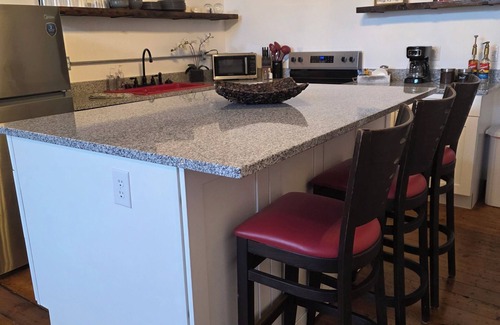Escape to this unique apartment in the quaint river town of Vevay, Indian. This unit, originally Delaney's Saloon from the early 1800s, features 1 cozy bedroom with a queen bed and a roll away twin, open living area, and ceilings that sore. The large countertop island with bar stools make the kitchen the perfect gathering space! Enjoy the convenience of amenities like AC, WiFi, and a washing and dryer. Whether you're here for a relaxing getaway or exploring the local attractions, this quaint apartment is the perfect home base for your stay. And it is centrally located between Louisville and Cincinnati. I hope you enjoy what my place, Vevay, and the surrounding areas have to offer..