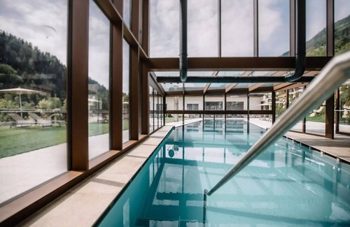 furniture made from local wood and natural materials create a cosy atmosphere Just a few steps away, you have access to a pool, a wellness area (partly available for an extra fee), and a children's playground, providing comfort and leisure fun.